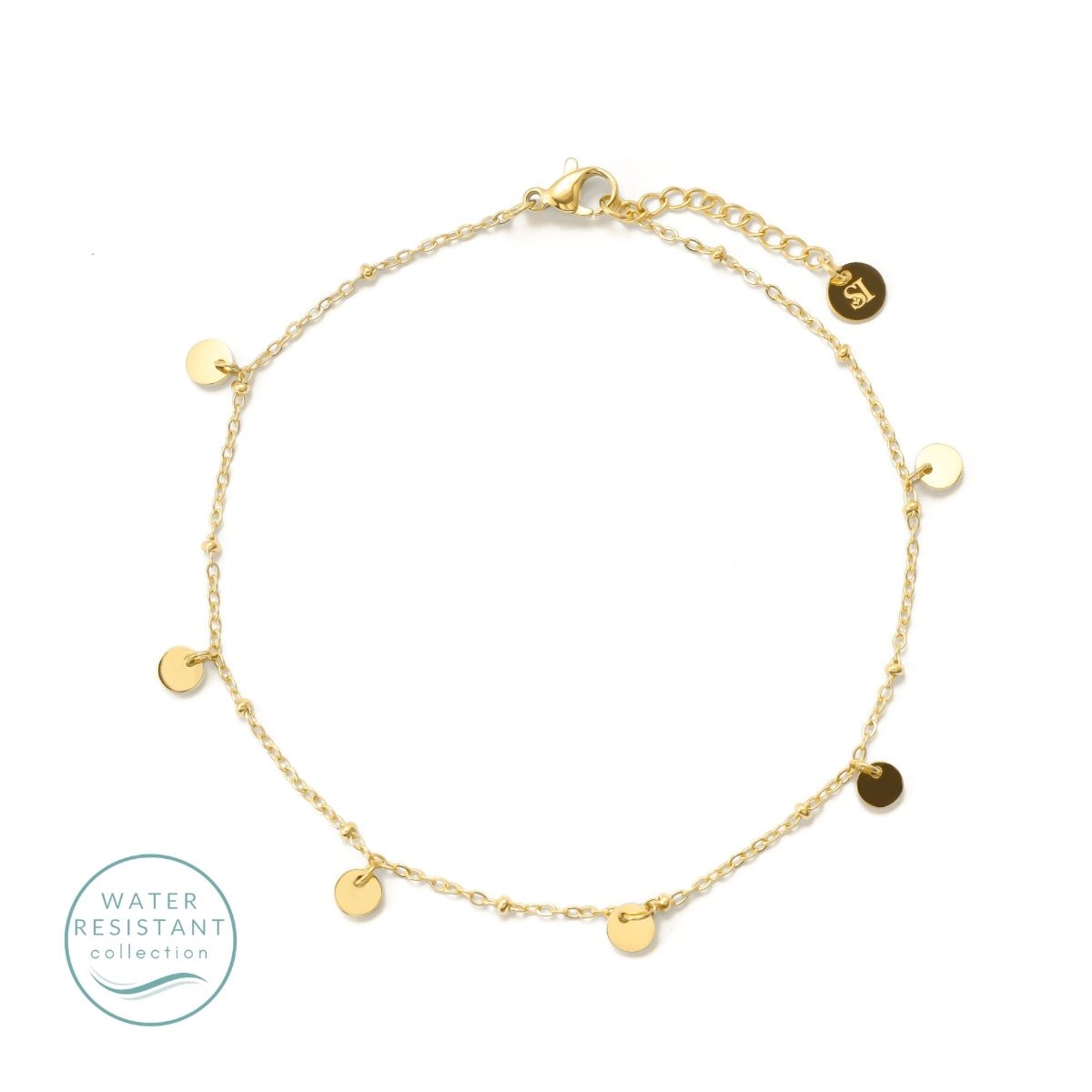 Sleek and effortlessly modern, the Contemporary Charm Anklet features a delicate chain adorned with minimalist round charm accents for a refined, everyday look. Crafted from stainless steel and finished with 18K gold plating, this water resistant anklet is designed to shine through daily wear, from beach days to evenings out. Lightweight, it offers comfortable all day wear while adding a subtle touch of elegance to any outfit. Perfect worn solo or layered with other anklets, this gold charm anklet is a timeless essential for a modern jewelry collection.