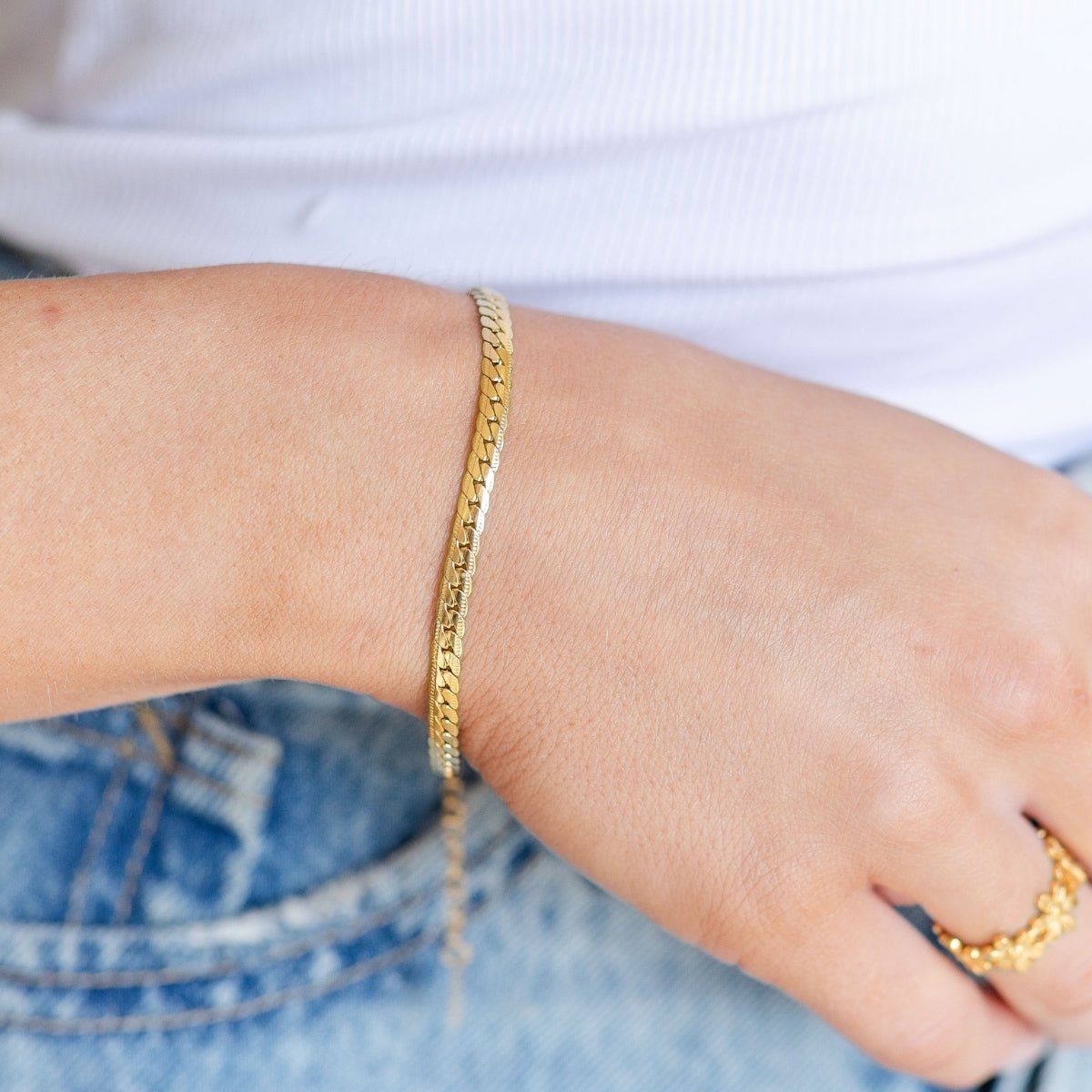 The Herringbone Bracelet features a sleek, textured design finished in radiant 18k gold plating. Crafted to be water resistant and durable, this timeless chain bracelet lays flat for a smooth, polished look. Perfect for everyday wear or layering, it’s a versatile essential that adds effortless elegance to any outfit.